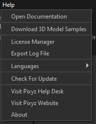 The Help Menu allows to access documentation, samples, manage Pixyz Review's license and contact Pixyz :