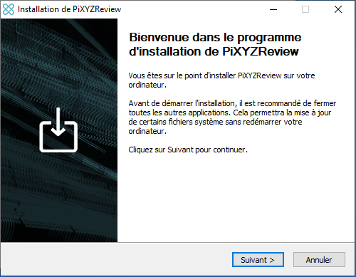 1) Go to the computer on which you wish to install Pixyz Review, and run the installation executable with administrator rights.