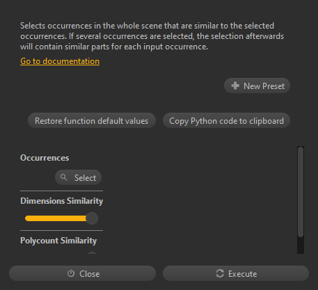 occurrences (OccurrenceList) : Occurrences for which we want to find similar occurrences in the scene. dimensionsSimilarity (Coeff) : The percentage of similarity on dimensions. A value of 1.0 (100%) will find parts that have exactly the same dimensions. A lower value will increase the likelyhood to find similar parts, at the cost of precision. polycountSimilarity (Coeff) : The percentage of similarity on polycount. A value of 1.0 (100%) will find parts that have exactly the same polycount. A lower value will increase the likelyhood to find similar parts, at the cost of precision.