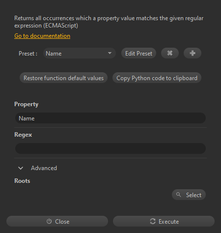 scene.findByProperty(property, regex[, roots]) -> occurrences