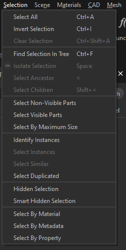 The Selection Menu contains a set of functions to quickly and automatically select Parts in the scene.