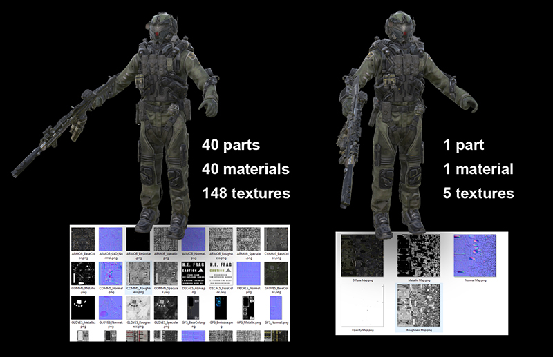 - Material information is transferred to a single set of textures. This set is used by a single material that's applied to the combined mesh.